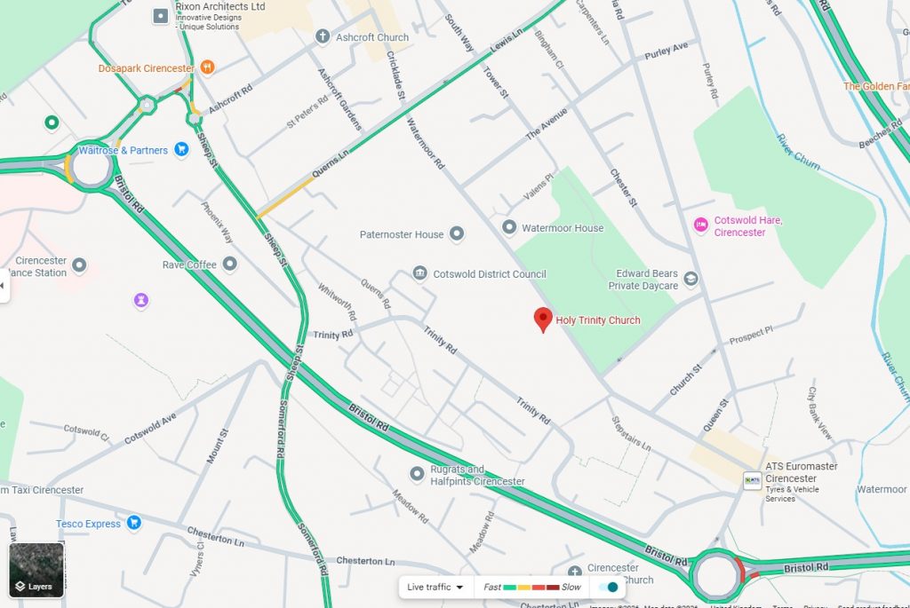 Pedestriam access is possible from either Watermoor road, (walk around to the back of the church to the seperate church hall building), or from Trinity road at the back, via the private drive.